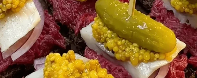 - Na každý plátok chleba položte lyžicu krému z červenej repy, niekoľko polkužeľ ochutenej cibule, plátky sleďa, trochu dijonskej horčice a celú malú uhorku, aby sa zvýraznila.